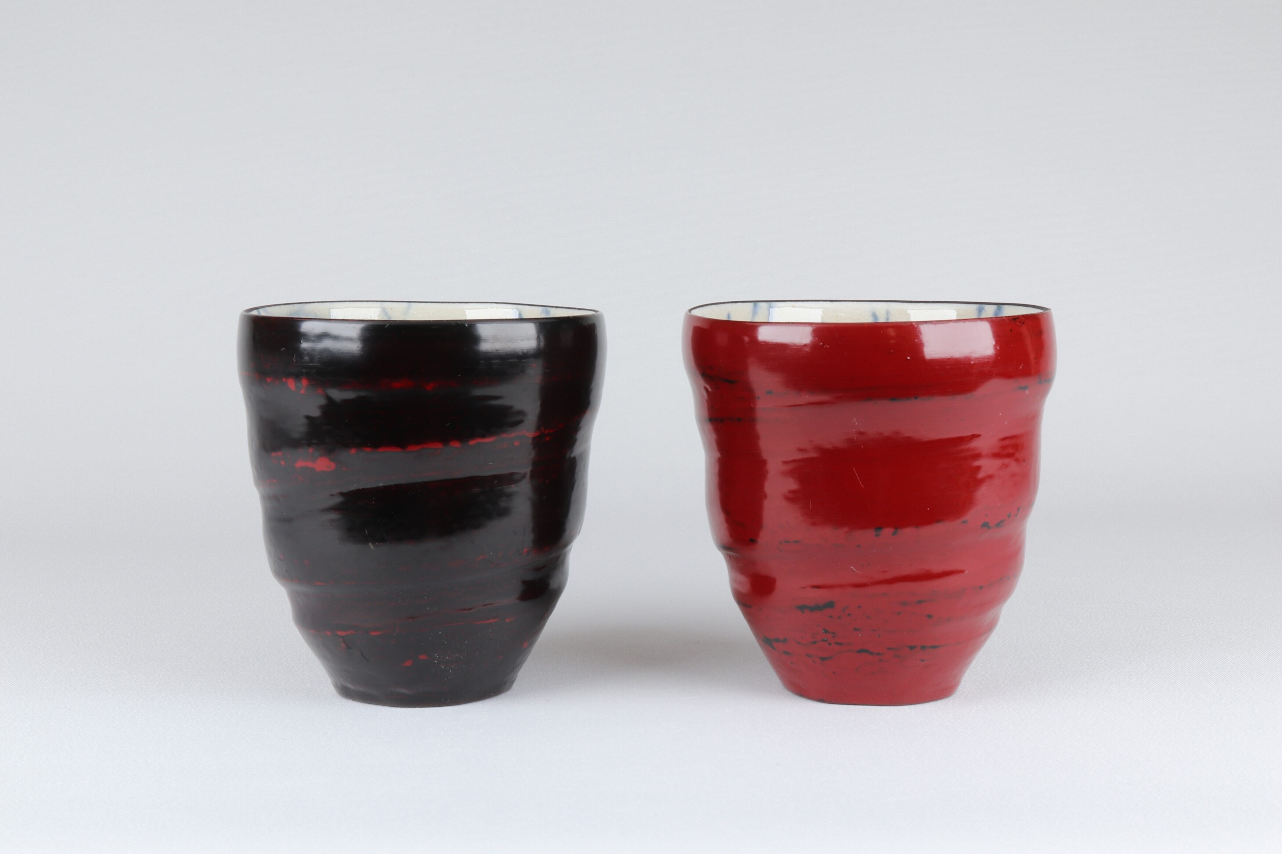陶器に本漆を施し、重厚で艶やかな美しさをもつ陶器の質感と、日本古来の深い色合いをもつ曙(黒)、根来(赤)の伝統的な漆塗りの質感を堪能できる二つの美を併せ持った器です。