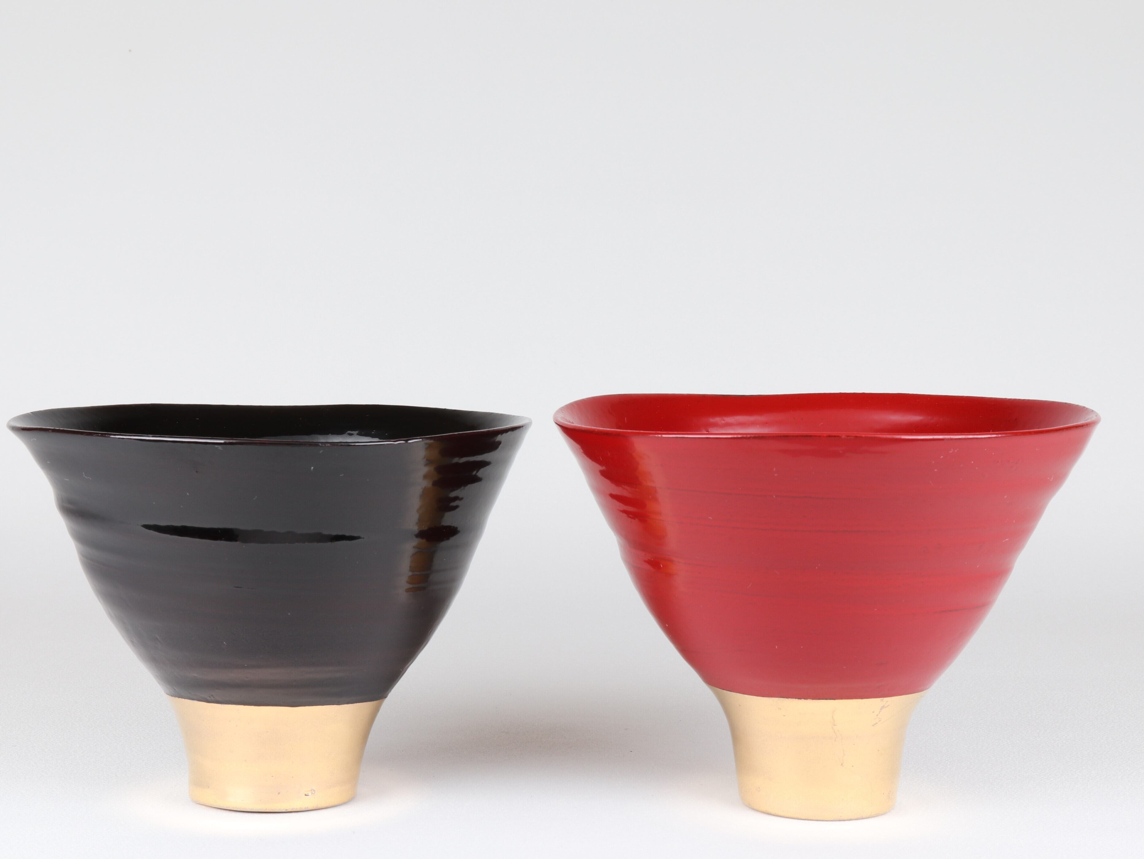 陶器に本漆を施し、重厚で艶やかな美しさをもつ陶器の質感と、日本古来の深い色合いをもつ曙(黒)、根来(赤)の伝統的な漆塗りの質感を堪能できる二つの美を併せ持った器です。高台の部分に金を施しています。