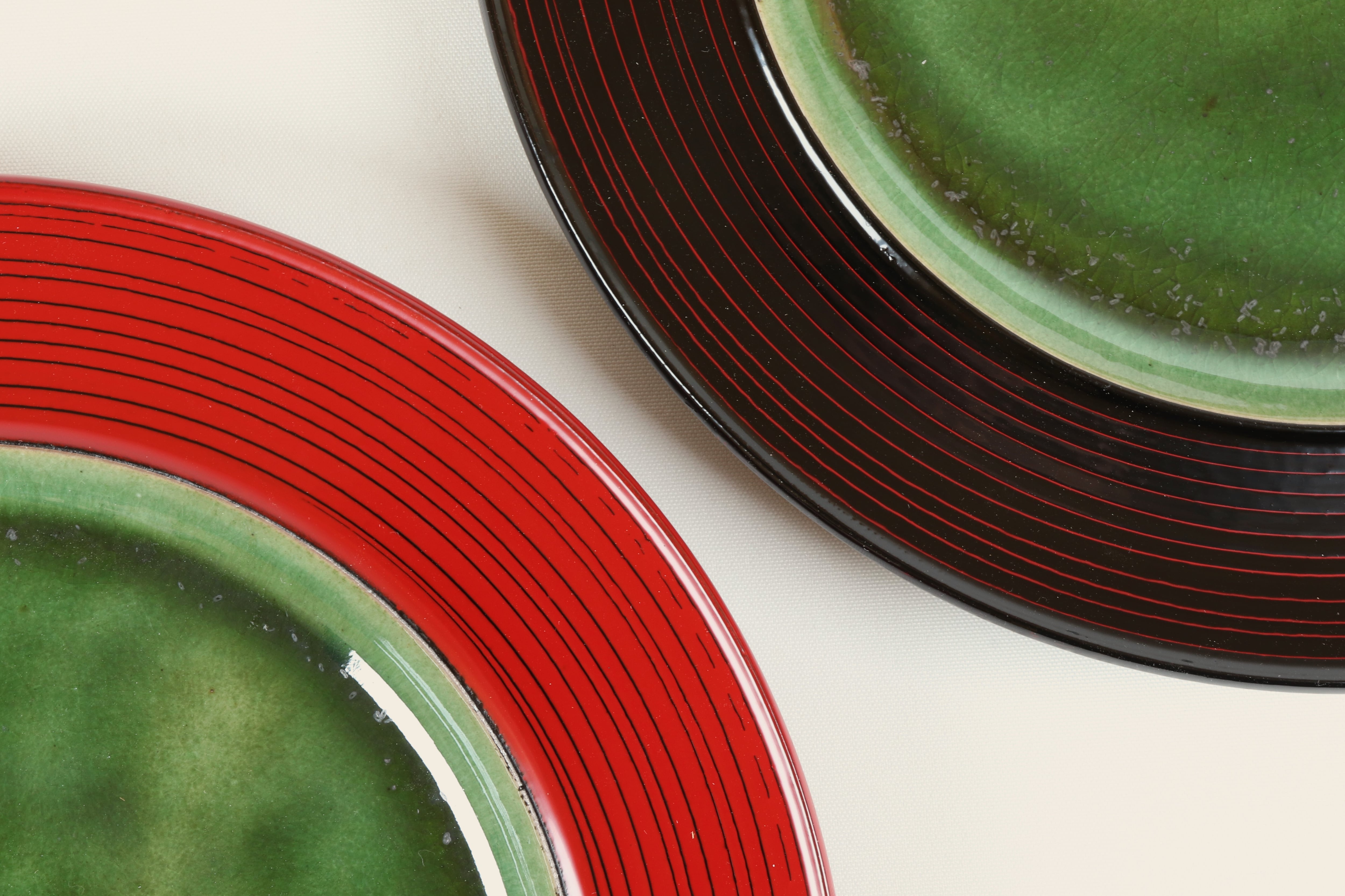 陶器に本漆を施し、重厚で艶やかな美しさをもつ陶器の質感と、日本古来の深い色合いをもつ曙(黒)、根来(赤)の伝統的な漆塗りの質感を堪能できる二つの美を併せ持った器です。